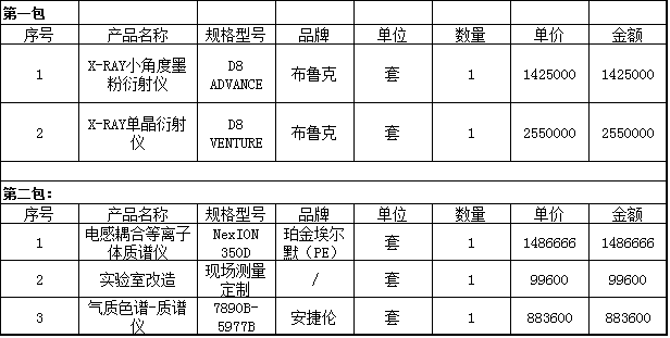 為進步提高教學科研水平,西北師范大學理科分析測試平臺建設項目對儀器設備以公開招標形式進行采購,近日對中標結果進行公布,珀金埃爾默、布魯克、上海儀電分析以及安捷倫等品牌儀器中標。此次采購共分為5包,其中1、2包為分析儀器類,1包中標金額為3975000元,2包中標金額為2469866元。